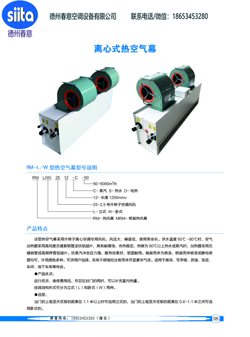離心式風幕機是經過高速電機帶動貫流或離心風輪發生的強壯氣流,以構成一面"無形的門簾"。將室表里分紅兩個獨立溫度區域創造舒適的室內環境,保持室內空調及凈化室內空氣的作用,節約電能的一起,并使得空氣循環,可有用的隔離塵埃、煙氣、臭氣 、昆蟲和微生物等。避免冷(暖)氣外流,既能夠節約用電也能有用避免冷(暖)氣外泄,將室表里分紅兩個獨立溫度區域,在空調機長時間運轉時,輔佐循環調節溫度,到達節約能源改善環境的目的、防塵、防蟲的作用。德州春意空調設備